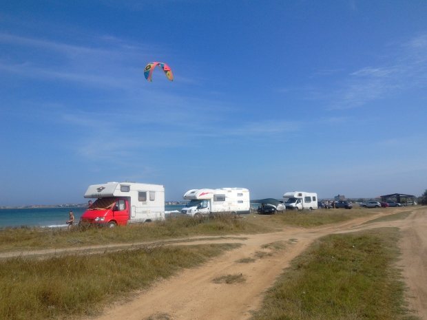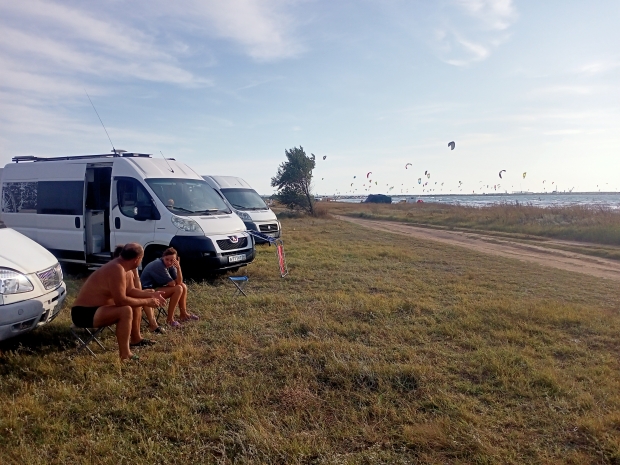 Школа кайтинга по соседству, а в деревья встать недалече по желанию возможность есть. Заезд и выезд с грунтовки на асфальт автодороги хороший. Любой автодом зайдет, да и с караваном не проблема.