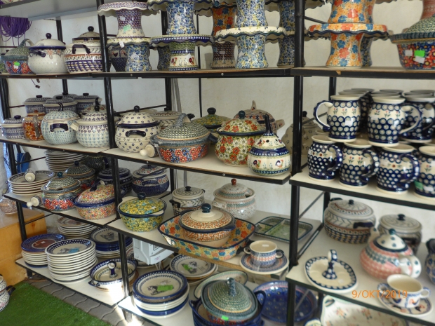 От разнообразия всяких тарелочек-чашечек-чайничков-кувшинчиков рябит в глазах. Вся посуда сделана из белой глины, украшена характерным орнаментом голубого или коричневого цвета, покрыта эмалью и прошла обжиг в специальной печи. Здесь применён ручной штемпельный метод декорации изделий, поэтому каждое изделие является неповторимым и единственным. Оттого, наверное и цены!!! Небольшая кружка от 60-80 злотых, побольше — от 100 злотых. Ну а уж горшки и кастрюли для запекания 400-500 злотых. (1 злотый — 17,16 рублей).