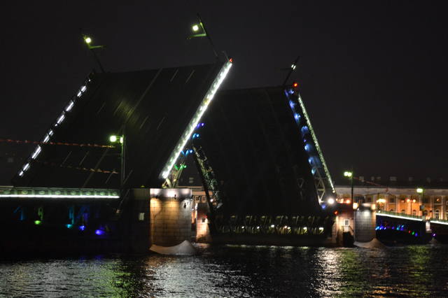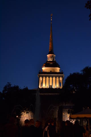 Кое как, возле Эрмитажа,продираемся к парапету и то рядом с дебаркадером,который немного закрывает обзор. Но лучше уж так, чем ни как... Время близится к началу. Начало запланировано на 1-40 ночи. Достаточно светло... Народу ко времени подгребает все больше и больше. И в вот началось!!! Уличное освещение потушили в зоне проведения шоу, начинает играть музыка... Вы видели когда нибудь пиротехническое шоу под классическую музыку? Я тоже не видел! ВОТ ЭТО ЗРЕЛИЩЕ!!!