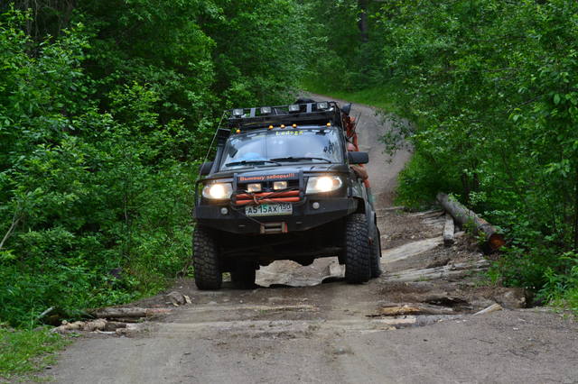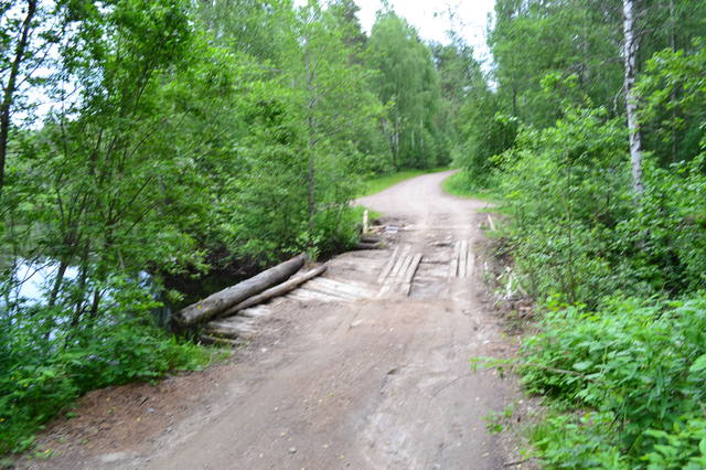 Сворачиваем с асфальта на гравийку, проезжаем километров 9 и поворот в лес. Оба на! Мостик!Старый, раздолбанный... Выхожу, проверяю, вроде выдержит... Вперед!!!