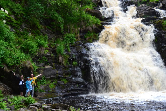 Из сети: ...Финское название - Ahvenkoski ("Окунёвый порог"). Ахвенкоски виден с дороги, по которой совсем недалеко до знаменитого парка "Рускеала". Ахвенкоски хорошо "обжит". На площадке около водопада есть парковка (30 руб., но можно остановиться и на обочине), кафе, сувенирный магазинчик, тир (по выходным). В 2005 г. на Ахвенкоски снимали фильм «Темный мир» (муляж избы, который соорудили для съёмок, сохранился). Здесь же снималась сцена купания главной героини фильма «А зори здесь тихие» (1972 г.) и сцены последнего боя...