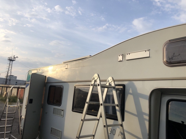 Пришлось потратить около получаса чтобы выковырить стенку из основного корпуса, стенка была перекошена и рулон намотан неравномерно. Ножницы на одной стороне вообще отсутствовали и при открытии передняя часть сразу повисла на рулоне, пришлось поддерживать на стремянке. Кое как мы её развернули и поставили на колья, но отсутствие ножниц с одной стороны не давало ей нормально стоять и она норовила завалиться вовнутрь. Короче полный трындец