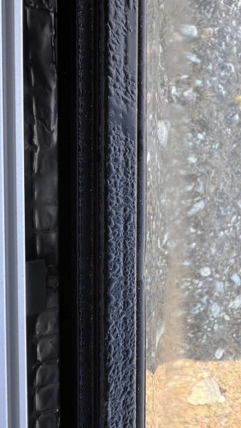 13) Помните выше говорил не забывать об окне в сан узле. Так вот там рама такой конструкции, что ее алюминиевый профиль просто соединяет улицу и помещение. Конденсат и промерзание обеспечены. И это окно приезжали проклеивать. Почему не проклеили всю поверхность, понимания нет.