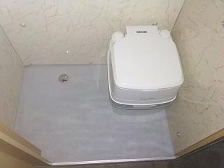 поддон покрашен, в последствии постелен красивый коврик, установлен обычный биотуалет